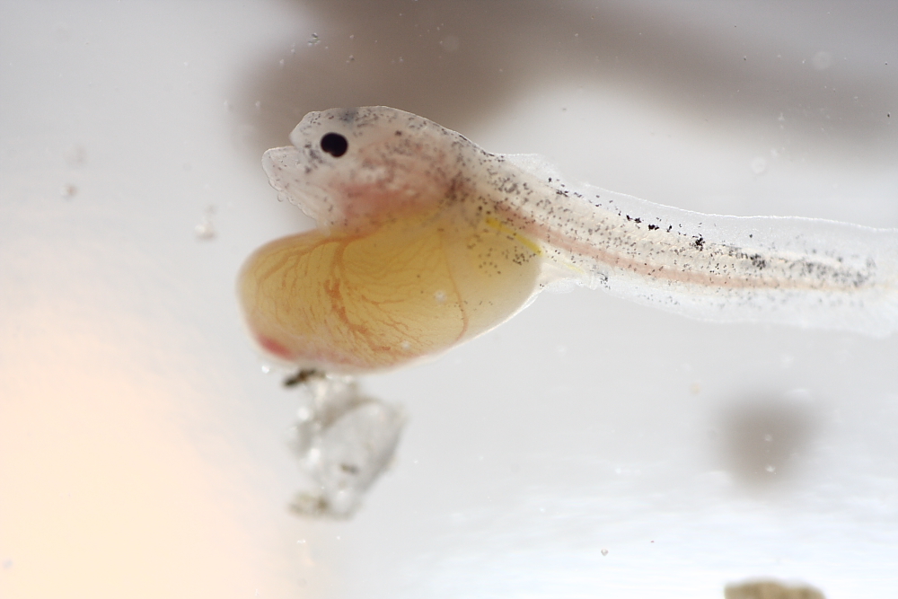Die Larven sind jetzt 1 cm lang und ähneln schon sehr den erwachsenen Chacas. Reste vom Dottersack sind noch zu sehen. Ich denke, dass die Ersternährung
