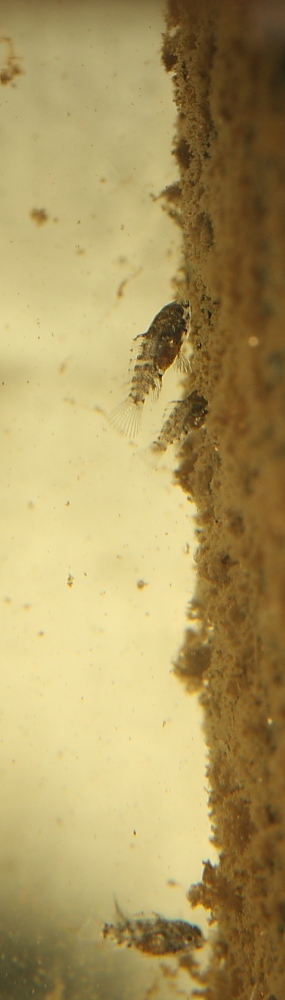 Nachdem ich das zweite Weibchen nie mehr wiedergesehen habe - weiß auch nicht, wie und warum das passiert ist - habe ich seit zwei Tagen das zweite Weibchen vermisst. Ich habe dann sorgenvoll mit einer Taschenlampe das Becken bis in den kleinsten Winkel abgeleuchtet und was sehe ich - das Weibchen mit einem Schwarm Nachwuchs! Sofort habe ich Artemien angesetzt und erstmal prophylaktisch ein paar Flocken feinstzerbröselt ins Becken gegeben. Ich weiß nicht, ob die Kleinen da rangehen, oder ob sie überhaupt schon Nahrung von außen zu sich nehmen..
